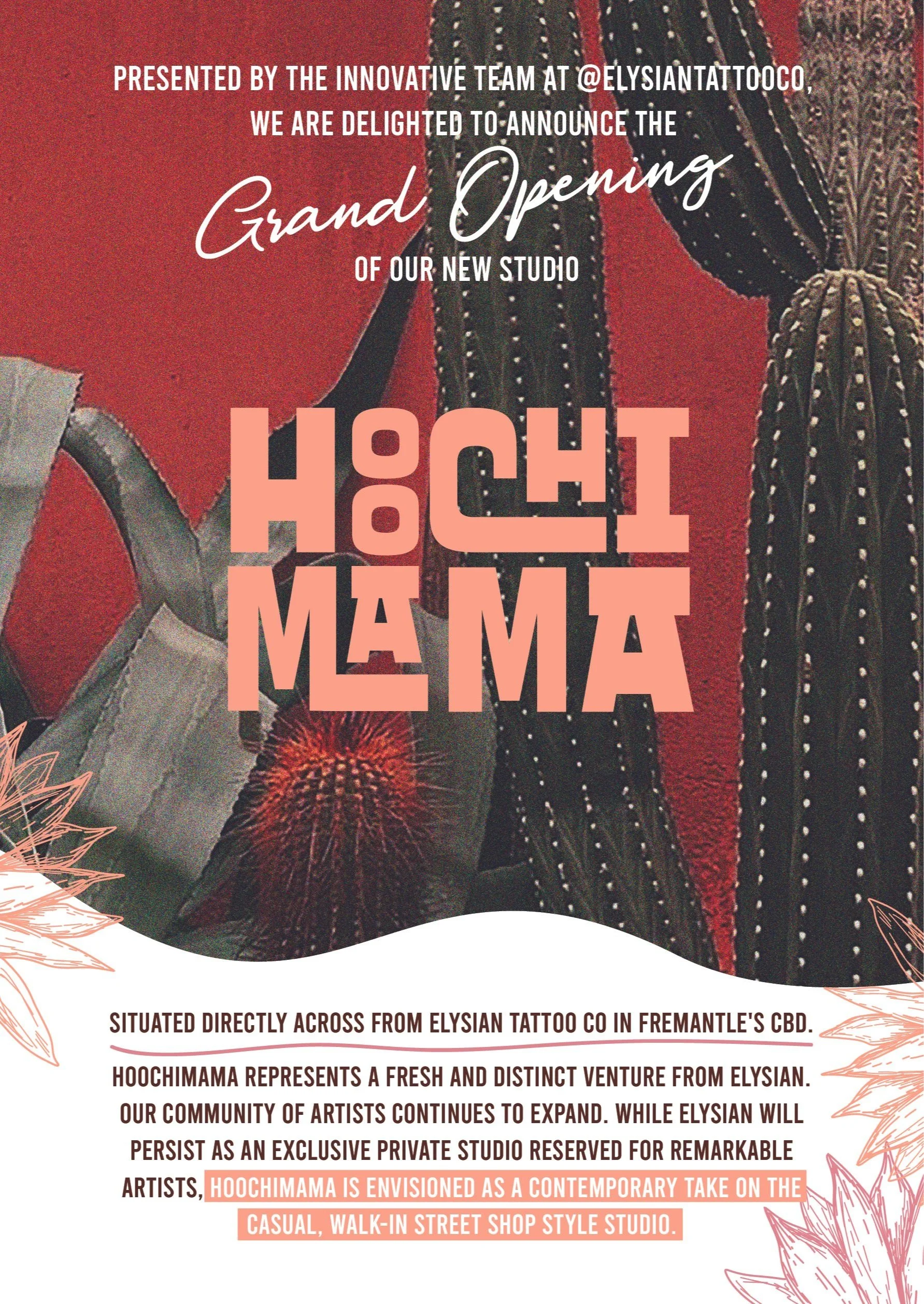 Exciting News: We are thrilled to announce the official opening of our second studio, Hoochimama! Located directly opposite Elysian Tattoo Co. in Fremantle, we are embarking on a unique journey separate from Elysian. Our focus is on popular tattoo styles like fine line, single line, minimalist, and micro realism, with the goal of setting new standards and leading trends in the region. While Elysian will remain an exclusive private studio space, Hoochimama is designed as a modern interpretation of a walk-in street shop style studio. This design allows our artists to have more interaction with customers and caters to a wider demographic.