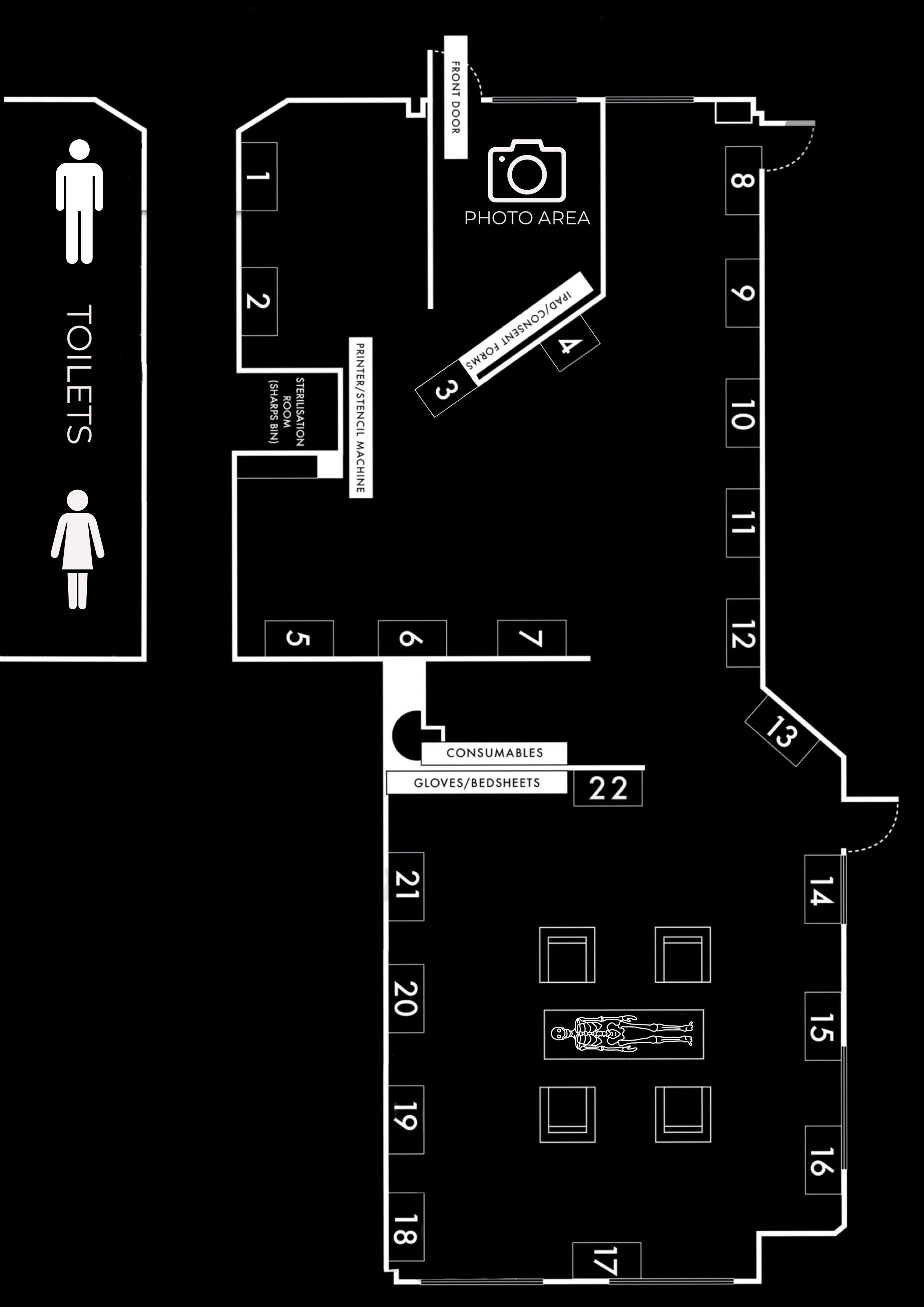 Our studio operates seven days a week, with most artists arriving at 10:00am and clients allowed in at 11:00am. We kindly request that artists refrain from seeing clients before the specified opening time to avoid disruption to our cleaning schedule. Additionally, we ask that all artists conclude their day by emptying their contaminated waste into the larger bin located in the sterilization room. Please also remember to turn off the artist light and place your chair on the bed to assist our apprentices with their cleaning responsibilities.